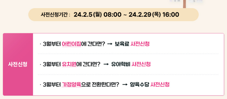 사전 신청 기간 24년 2월 5일 오전 8시 ~ 24년 2월 29일 오후 4시 온라인 신청의 경우 마감시간이 오후 4시이니 잘 확인해야 한다. 복지로 보육서비스 사전신청 안내