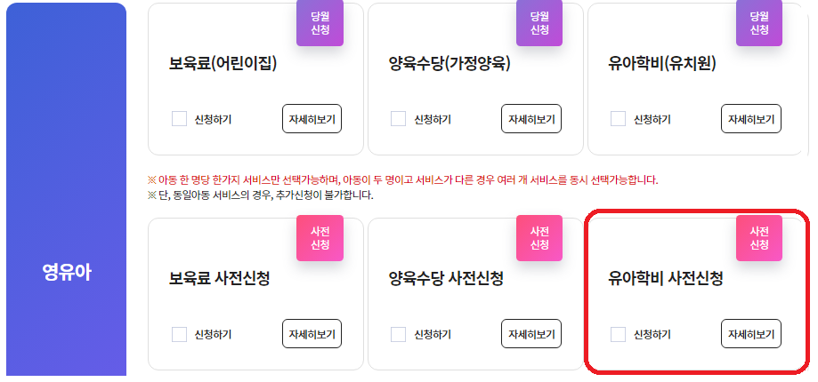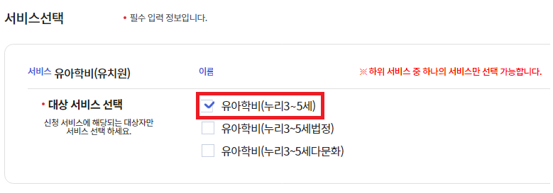 개인정보 활용동의 및 기본정보 입력 후 아래 내용만 추가로 확인해보면 좋다. 일반적인 경우라면 유아학비(누리3~5세) 선택한다.