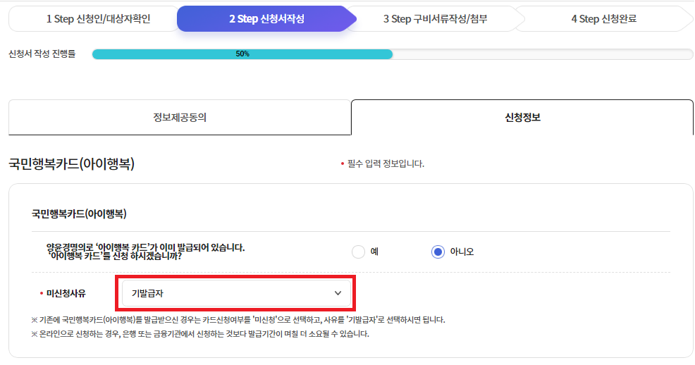 국민행복카드가 이미 있으면 미신청사유에 [기발급자]를 선택하면 된다.
