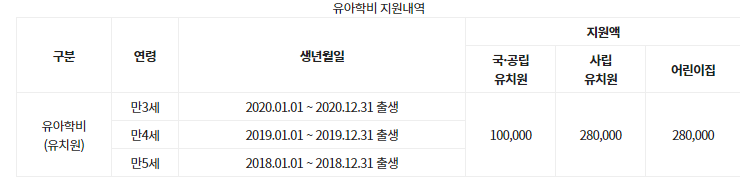 유아학비 지원 금액 (만3~5세 교육비) 국/공립 월 10만원, 사립 월 28만원 (만3~5세 방과후 과정비) 국/공립 월 5만원, 사립 월 7만원 (저소득층 유아학비 실비 지원) 사립 월 최대 20만원 범위 내