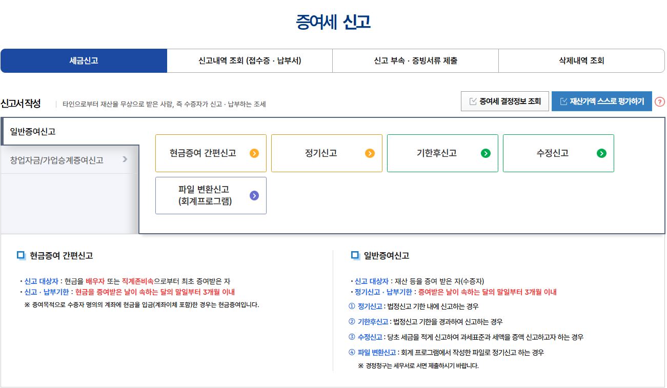 2. 세금신고 > 증여세 신고 > 일반 신고 > 현금증여 간편신고 : 첫 증여인 경우 간편신고 메뉴에서 편리하게 작성 가능