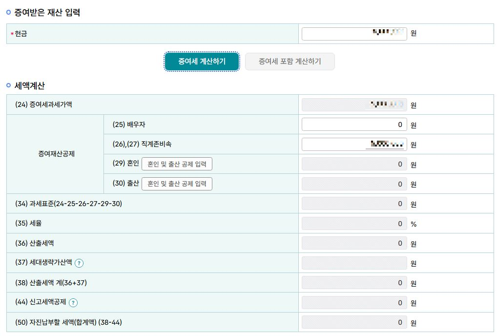4. 증여 금액 입력 후 증여세 계산하기 클릭 시 자동 세액 계산됨.